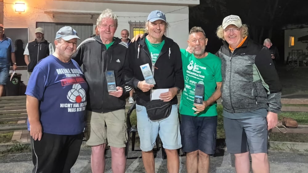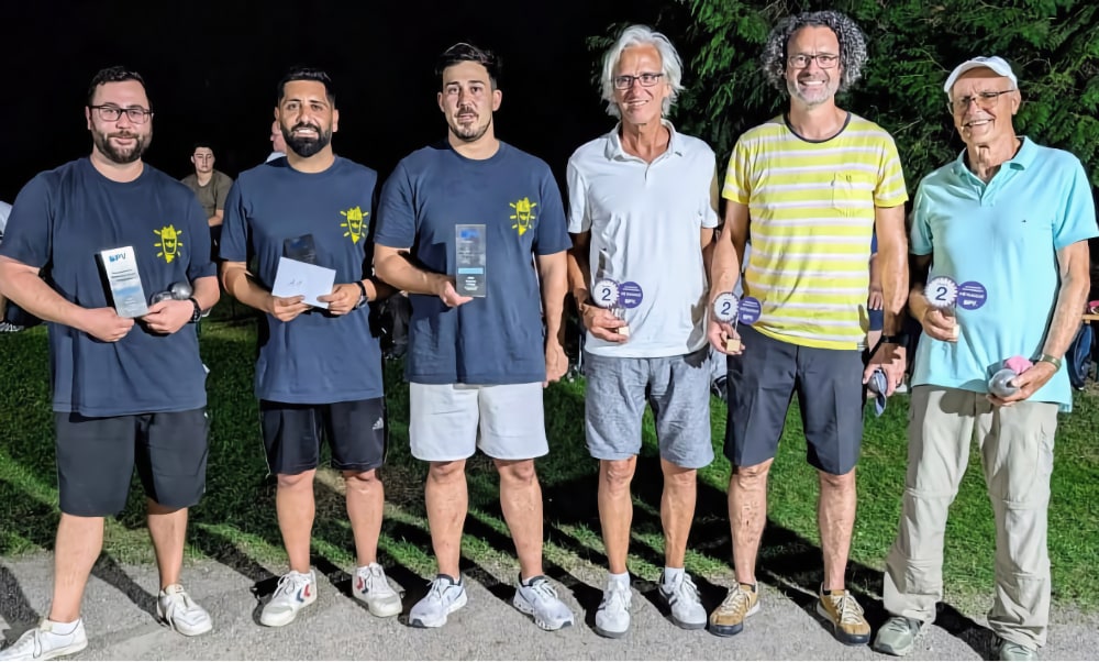 Die Boulefreunde Niedernberg hatten zu den Bayerischen Meisterschaften 55+ eingeladen. Im Finale setzte sich das Team mit Albin, Tita und Sigi gegen die Mannschaft aus Niedernberg und Aschaffenburg mit Eric, Peter und Dietmar durch. Für Albin war dieser Erfolg ein besonderer und zugleich ein runder Meistertitel: Es war seine 20. Einzelmeisterschaft (die Mannschaftsmeisterschaften in der Bayernliga sind dabei nicht mitgerechnet). Kein anderer Spieler im BPV kann bisher mehr sportliche Erfolge aufweisen.
