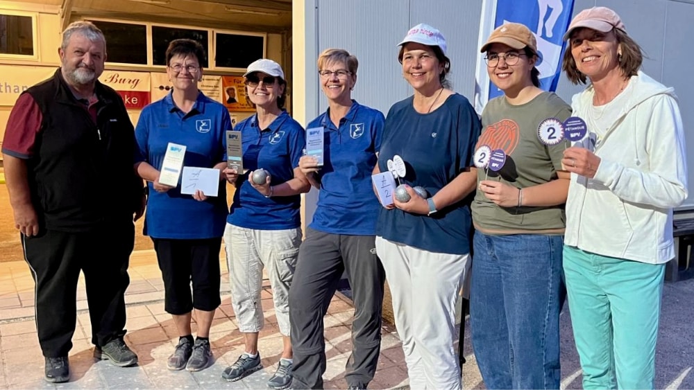 Wieder Burgthann. Der PC-Burgthann begrüßte 78 Frauen bei der Kombi-Veranstaltung Bayerische Meisterschaft und Qualifikation zur Deutschen Meisterschaft. Das Finale „A“ spielten Martina, Isolde und Doris (SV 1971 Schnackenwerth) gegen Domino, Stefani (beide pétanque münchen) und Lola (PCNC). Als Gewinnerinnen gingen die drei Frauen der SV 1971 Schnackenwerth vom Platz.