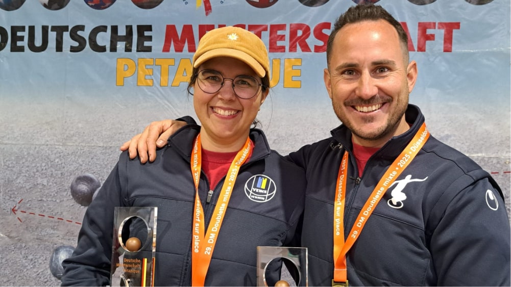 Die 29. Deutsche Meisterschaft Doublette-mixte wurde in Düsseldorf ausgetragen. Domino Probst (pétanque münchen) und Matthias Laukart (PC Burggarten Horb) traten als Team für BaWü 02 bei der Deutschen Meisterschaft an und erreichten das Halbfinale. Herzlichen Glückwunsch an Domino und Matthias zu einem großartigen dritten Platz – eine starke Leistung im hochklassigen Teilnehmerfeld!