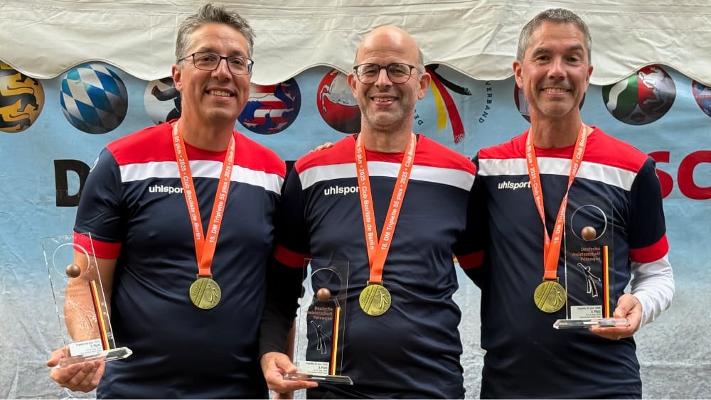 Die Deutsche Meisterschaft 55 + fand auf dem Gelände des Club Bouliste Berlin e.V. in Berlin-Tegel statt. Besonders erfolgreich präsentierte sich das Team Bay 05 mit Claus, Florian und Ulrich. In einem stark besetzten Teilnehmerfeld behaupteten sie sich eindrucksvoll und erreichten einen hervorragenden dritten Platz.